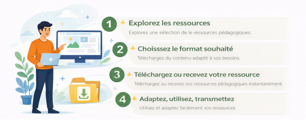 Chaque ressource est pensée pour s’adapter aux usages concrets des professionnels de l’éducation : en classe, en atelier ou dans des contextes éducatifs variés. Les contenus sont clairs, pratiques et directement exploitables, afin de limiter le temps de préparation et de favoriser une mise en œuvre rapide.